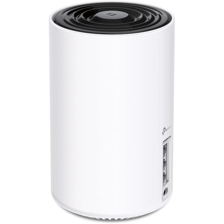 Security features include SPI Firewall, IP address and MAC address filtering, and IP/MAC address binding. It operates in temperatures ranging from -22°F to 140°F and humidity levels of 10% to 90% RH. This purchase / package contents includes the Deco BE65-Outdoor unit, an AC Power Cord, a RJ45 Ethernet Cable, a Wall/Pole Mounting Kit (Pole Mounting Strap, Plastic Wall Anchors, Self-Tapping Screws), and an Installation Guide. It has regulatory certifications from the FCC.